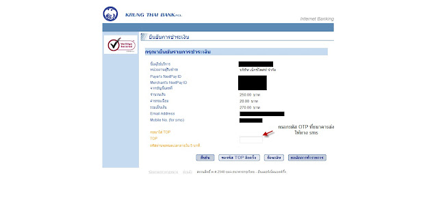 7. คราวนี้คุณจะอยู่ ในหน้าที่บอกรายระเอียดข้อมูลการทำธุรกรรม และ คุณจะเห็นช่องให้กรอกรหัส OTP ที่ส่งให้คุณทาง sms ผ่านหมายเลขโทรศัพท์มือถือที่คุณใช้สมัคร KTB Online ที่ธนาคารกรุงไทย หลังจากกรอกรหัสที่ได้รับแล้ว ให้คุณคลิกที่ยืนยัน