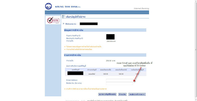 6. ในหน้านี้ทางธนาคารกรุงไทย จะให้คุณใส่ Email และ เบอร์โทรศัพท์มือถือ ที่ใช้สมัคร KTB Online ให้คุณกรอกข้อมูลให้เรียบร้อย จากนั้นคลิกที่ชำระเงิน